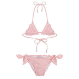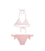 The 2-piece triangle bikini with ruffled selvages for girls. Made out of a pink striped seersucker fabric, a material facilitating heat dissipation and air circulation. All our products are designed and handmade in Italy.