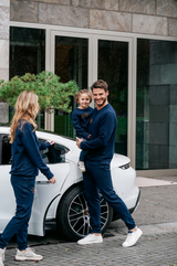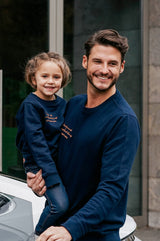 The kids sweater navy blue is made from organic cotton and recycled polyester. The unisex sweater comes with a roundneck and is rib knitted around hem, neck and sleeve ends. Embellished with the fa-Mi-ly embroidery it matches the whole collection.