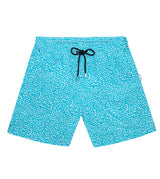 White swim shorts with turquoise mini coral print and elasticated drawstring waist. They’ve got two side pockets, a zip back pocket and a locker loop inside. So you can hang them up to dry after a swim in the pool. The shorts are made from quick-drying shell and lined with mesh for breathable support whether you're in or out of the water. They fold down small enough to fit in your hand luggage.