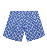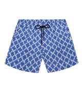 Blue swim shorts with white coral check print and elasticated drawstring waist. They’ve got two side pockets, a zip back pocket and a locker loop inside. So you can hang them up to dry after a swim in the pool. The shorts are made from quick-drying shell and lined with mesh for breathable support whether you're in or out of the water. They fold down small enough to fit in your hand luggage.