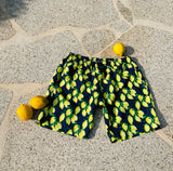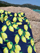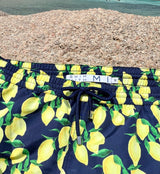 The dark blue SAINT TROPEZ SWIM SHORTS with the yellow Amalfi Lemons Print are perfect blend of style and summertime charm. Inspired by the vibrant citrus groves of the Amalfi Coast, these shorts feature a refreshing lemon print that exudes sunny vibes. Crafted with quality and comfort in mind, these swim shorts are an essential addition to your beach wardrobe.