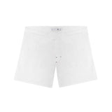 White swim shorts with hook-and-loop fastener.