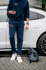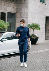 The Sweater for him in navy blue is made from organic cotton and recycled polyester. The classic roundneck sweater can be worn comfortable at home or for a relaxed style with a pair of jeans. Our fa-Mi-ly embroidery matches the collection for the whole family.