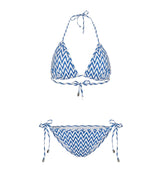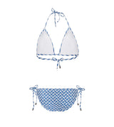 Classic 2-piece triangle bikini in white with blue Zig Zag print.