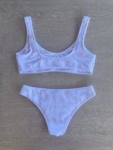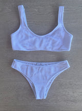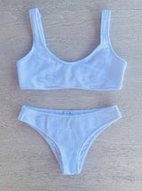 Classic and cut to support in all the right places. Our classic white SCRUNCHI BIKINI for an easy beach chic style. And we all know there is nothing better than a white Bikini in summer.