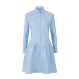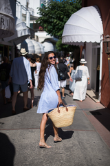 Light blue breathable Italian linen dress, a timeless and beautiful handcrafted piece. Embellished with mother-of-pearl buttons and to add some ease, sport cuffs, it's ideal for strolling along the beach on your next vacation or for wearing during hot summers in the city.