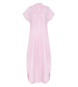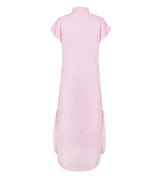 The BEACH SHIRT DRESS is a pale pink linen dress with an Italian kent collar and floor length. Comes with a straight button line with mother-of-pearl buttons and cap sleeves. All our products are designed and handmade in Italy.