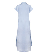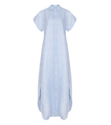 The BEACH SHIRT DRESS is a light blue linen dress with an Italian kent collar and floor length. Comes with a straight button line with mother-of-pearl buttons and cap sleeves. All our products are designed and handmade in Italy.