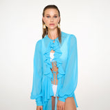 Elegant Ruffle Details: Delicate ruffles adorn the neckline and front, adding a playful yet refined element to the overall look.