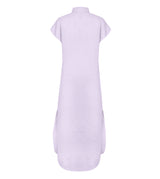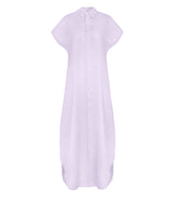 The BEACH SHIRT DRESS is a lilac linen dress with an Italian kent collar and floor length. Comes with a straight button line with mother-of-pearl buttons and cap sleeves. All our products are designed and handmade in Italy.