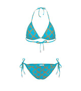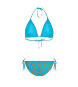Classic 2-piece triangle bikini in turquoise with signature "Coral Check" print in orange.